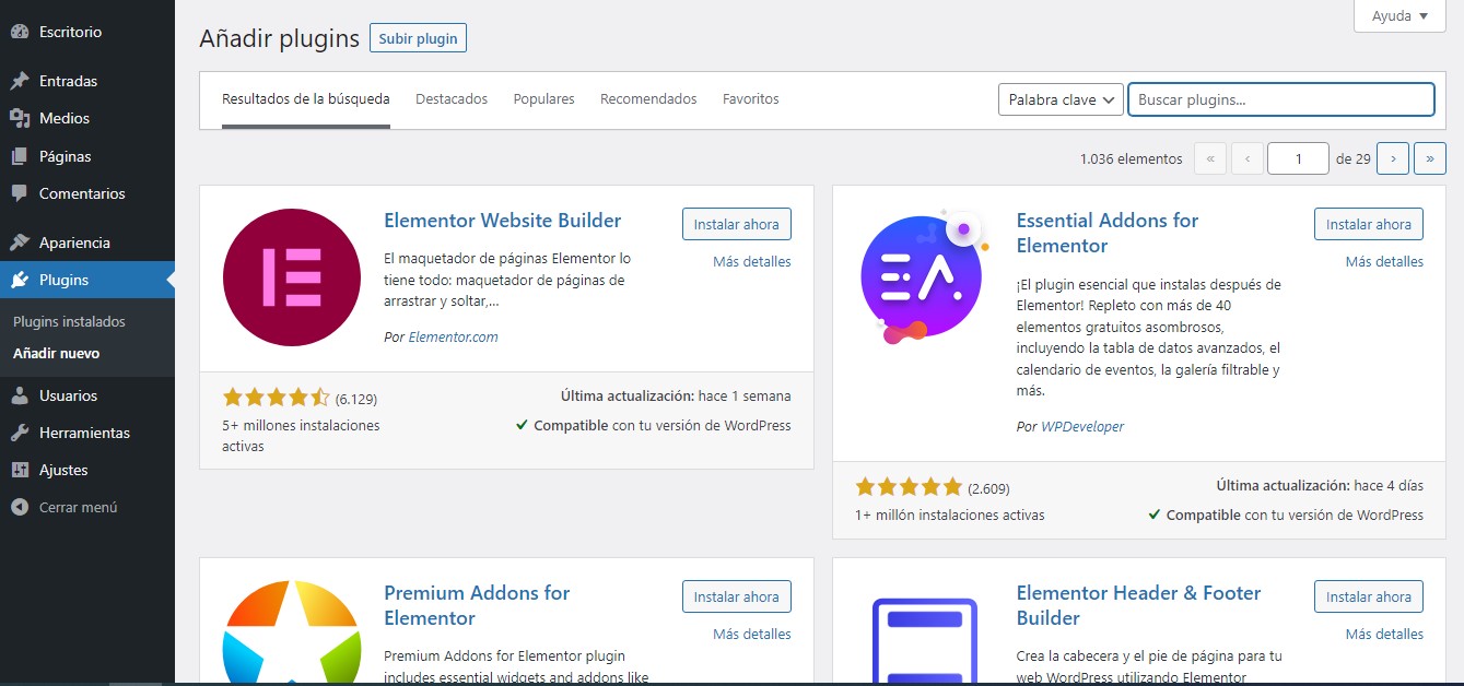 Para instalar Elementor, ingresa a la sección plugins de WordPress, luego haz click a «Añadir nuevo» y en el buscador escribe «Elementor». Te saldrá como primera opción: «Elementor Website Builder» y ese mismo será el que tendrás que instalar.