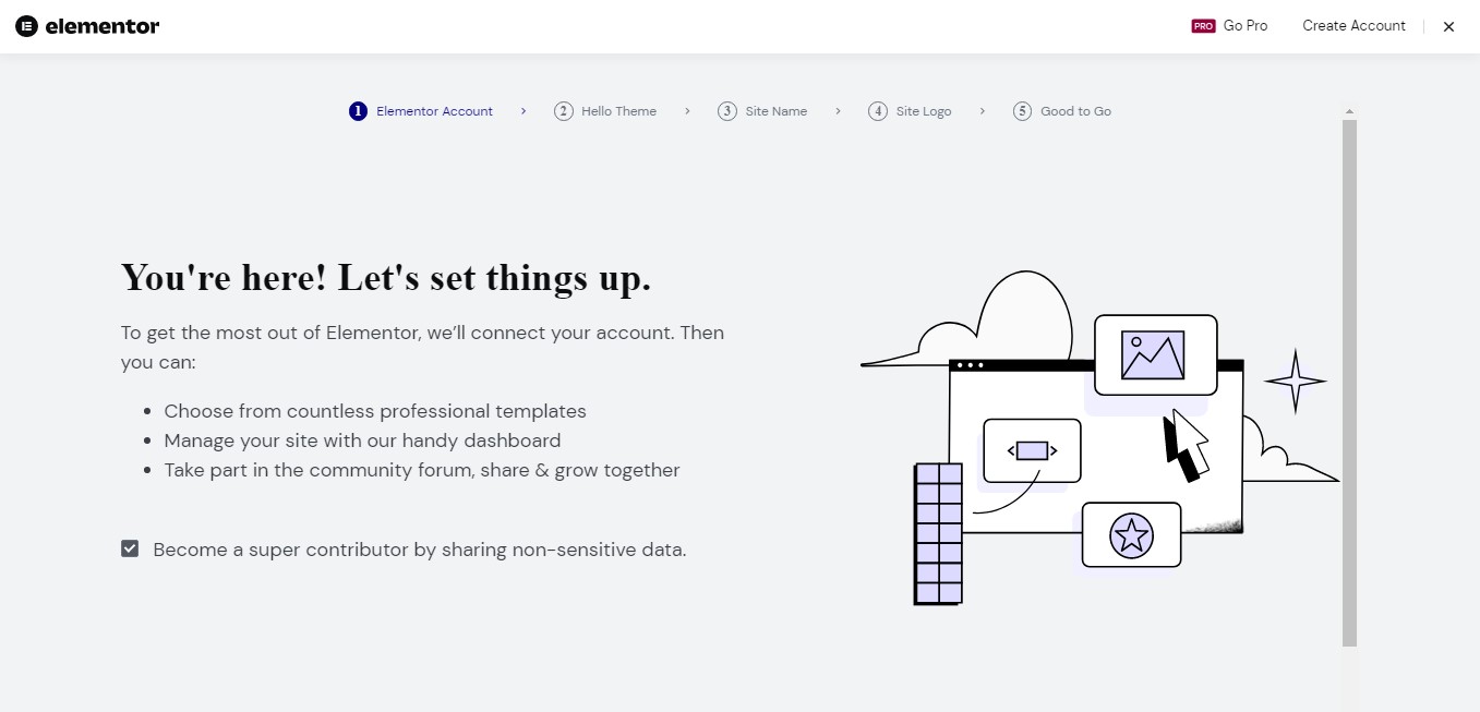 Una vez instalado te aparecerá la siguiente página que te guiará para hacer otras configuraciones en Elementor. En este caso, vas a cerrarla en la parte superior derecha donde hay una cruz.