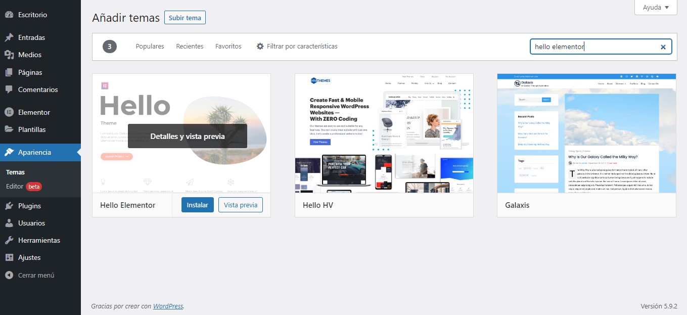 Después, anda a la sección «Apariencia» en el menú de WordPress y entra donde dice «Temas». Al igual que con la instalación del plugin, usa el buscador y escribe «Hello Elementor». Este es un tema que está diseñado para usar con el plugin que acabas de instalar. Lo instalás, lo activás y listo.