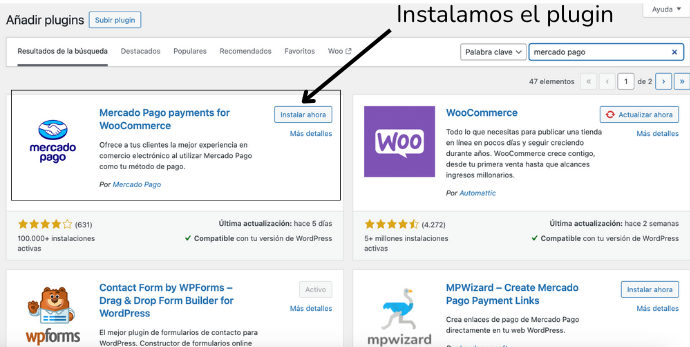 - Instala el plugin: Cuando aparezca el plugin de Mercado Pago en los resultados de búsqueda, haz clic en «Instalar ahora».