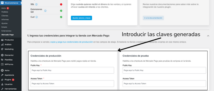 - Completa los campos obligatorios con tus credenciales de prueba y de producción. Si aún no dispones de esta información, consulta nuestra documentación sobre Credenciales y sigue las instrucciones paso a paso para obtenerlas.