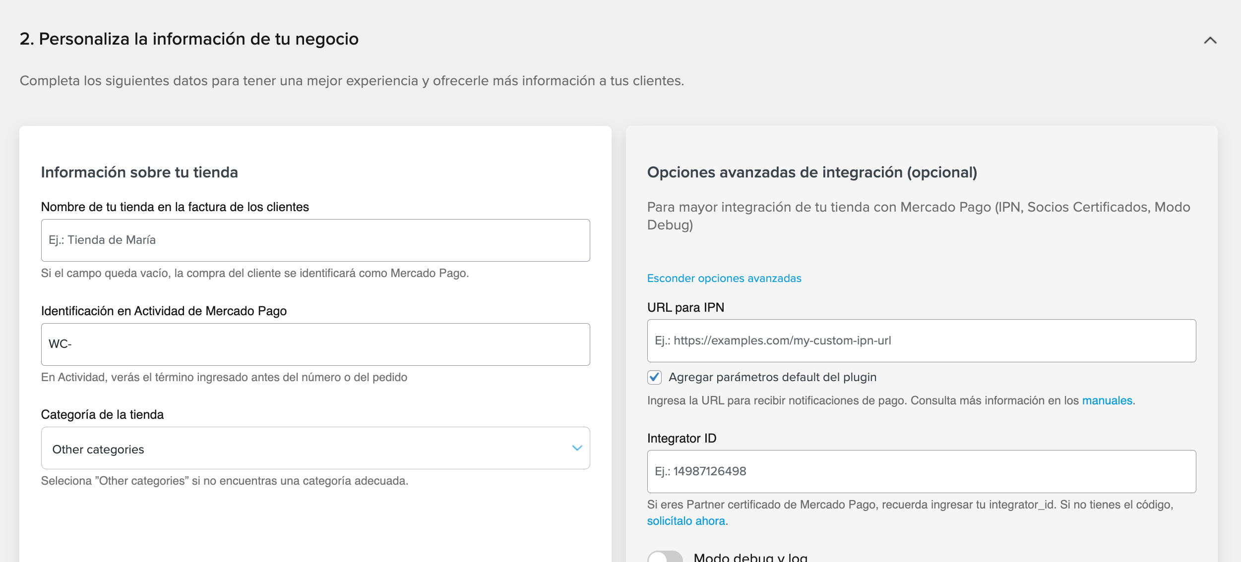 - Integrator ID: Ingresa tu ID de integrador como miembro del programa de Mercado Pago. Si aún no eres miembro, haz clic aquí para obtener más información.
