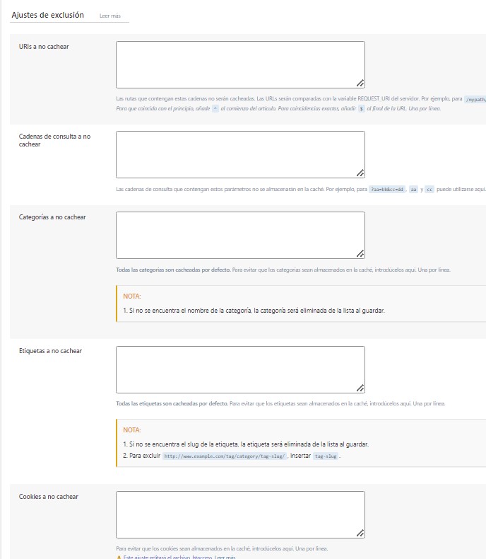 De manera inversa a los vaciados, podrás gestionar las exclusiones por URLs, categorías o tags si no quieres que alguna de ellas actualice los archivos que guardas en el caché porque prefieres dejarlas estáticas por alguna razón.