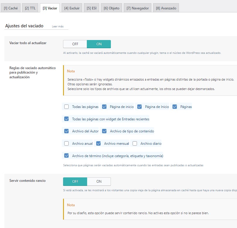 Es importante que la opción de “Vaciar todo al actualizar” esté activada. Así podrás mostrarle a los usuarios que ingresen a tu sitio web los cambios realizados y que con base en la última versión de tu WordPress, guardarás el caché correcto.