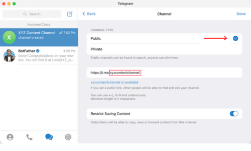 También debes crear un enlace público para que sea fácil encontrarte y unirte. Simplemente escriba un ID único después de https://t.me/. Anote el ID porque lo necesitará más adelante cuando establezca el plugin en WordPress.