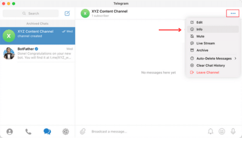 Con tu canal seleccionado en Telegram, tienes que hacer clic en el menú ‘…’ de la parte superior derecha de la pantalla y seleccionar ‘Info’ en el menú desplegable.