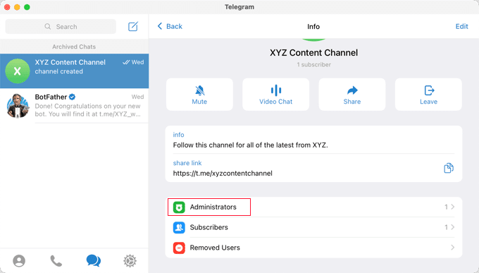 Cuando hagas clic en “Hecho”, se creará tu canal de Telegram, y ahora tendrás que añadir tu bot como administrador.
