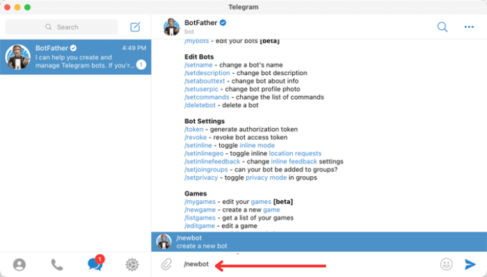 Escribe el comando /newbot en el chat para comenzar.