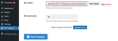 Después de eso, debes volver a tu sitio web y pegar el token en el campo Bot Token en WP Telegram.