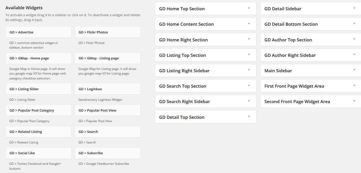 Uno de los puntos fuertes de GeoDirectory es su flexibilidad con widgets, lo que permite modificar prácticamente cualquier parte del directorio mediante drag-and-drop en el panel de administración (Apariencia > Widgets).