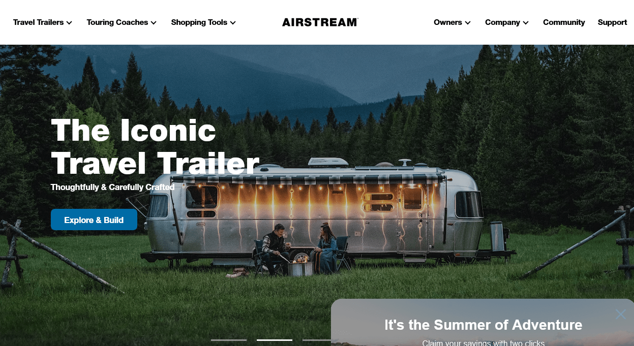 Los visitantes pueden concentrarse inmediatamente en su producto con esta combinación. Los visitantes obtienen una comprensión más rápida del negocio de Airstream gracias al texto grande y al botón de llamada a la acción (CTA) que acompañan las imágenes.