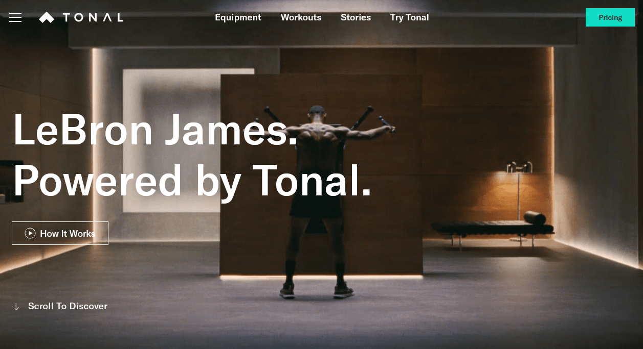 Otro ejemplo de una página web de negocios que utiliza WordPress se encuentra en esta lista. Tonal ofrece equipos de gimnasio en casas inteligentes a atletas y entusiastas des deporte. El sitio web combina su producto de alta tecnología con un diseño sofisticado y simple.