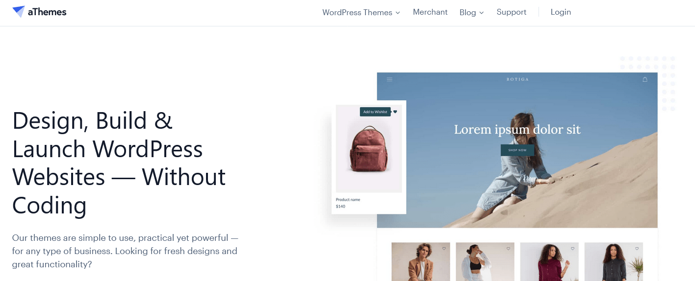 aThemes es un ejemplo de una página web comercial de este tipo. Esta empresa de desarrollo de temas de WordPress utiliza un texto grande para explicar los beneficios de su producto y lo acompaña con un botón CTA para aumentar la tasa de conversión.