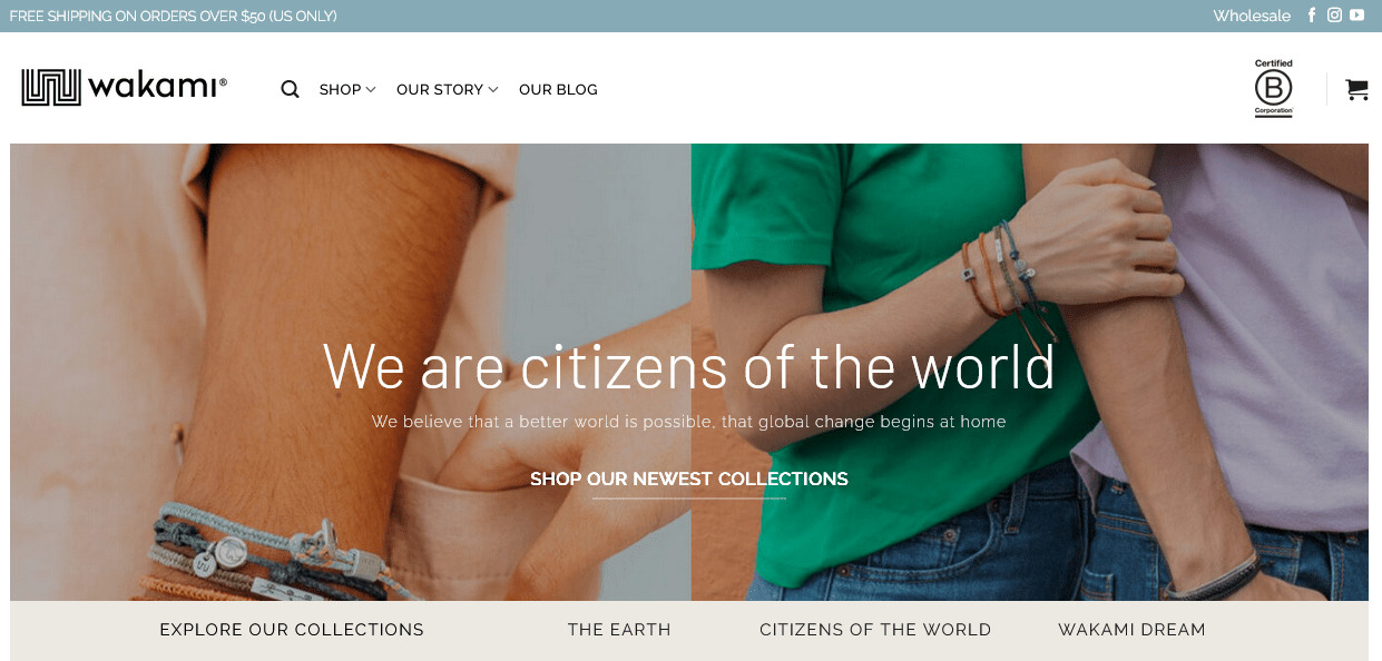 Wakami, una tienda tradicional de pulseras, es un buen ejemplo de un sitio web de comercio electrónico que tiene valores de marca social fuertes. Esto es crucial porque es más probable que los clientes compren productos de una marca que comparta sus valores.