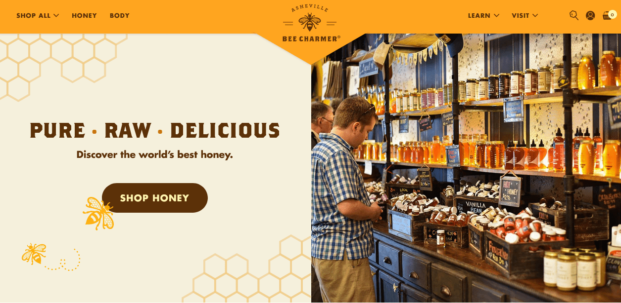 La página de inicio de este sitio de comercio electrónico muestra todas las categorías de productos en el menú de navegación. Esto ayuda a los visitantes a decidir rápidamente qué comprar, lo cual es particularmente beneficioso porque Ashville Bee Charmer ofrece una amplia gama de productos.