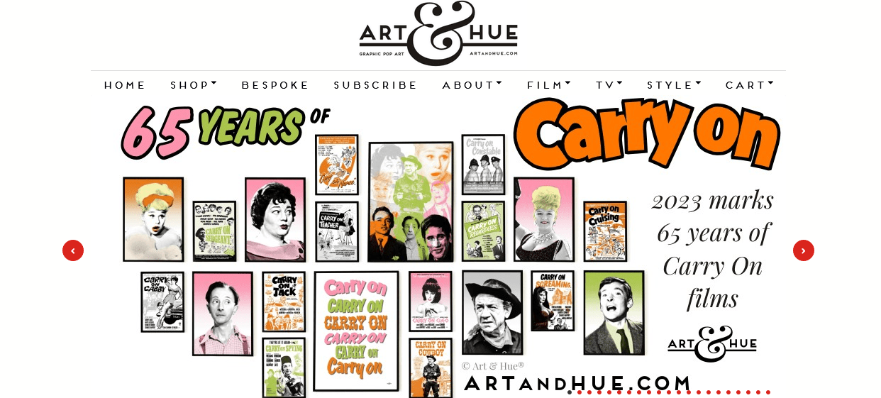 La tienda de arte pop en línea Art & Hue opta por un diseño extravagante en lugar de un estilo minimalista popular. Todo el sitio usa una mezcla de colores brillantes y una tipografía que se destaca.