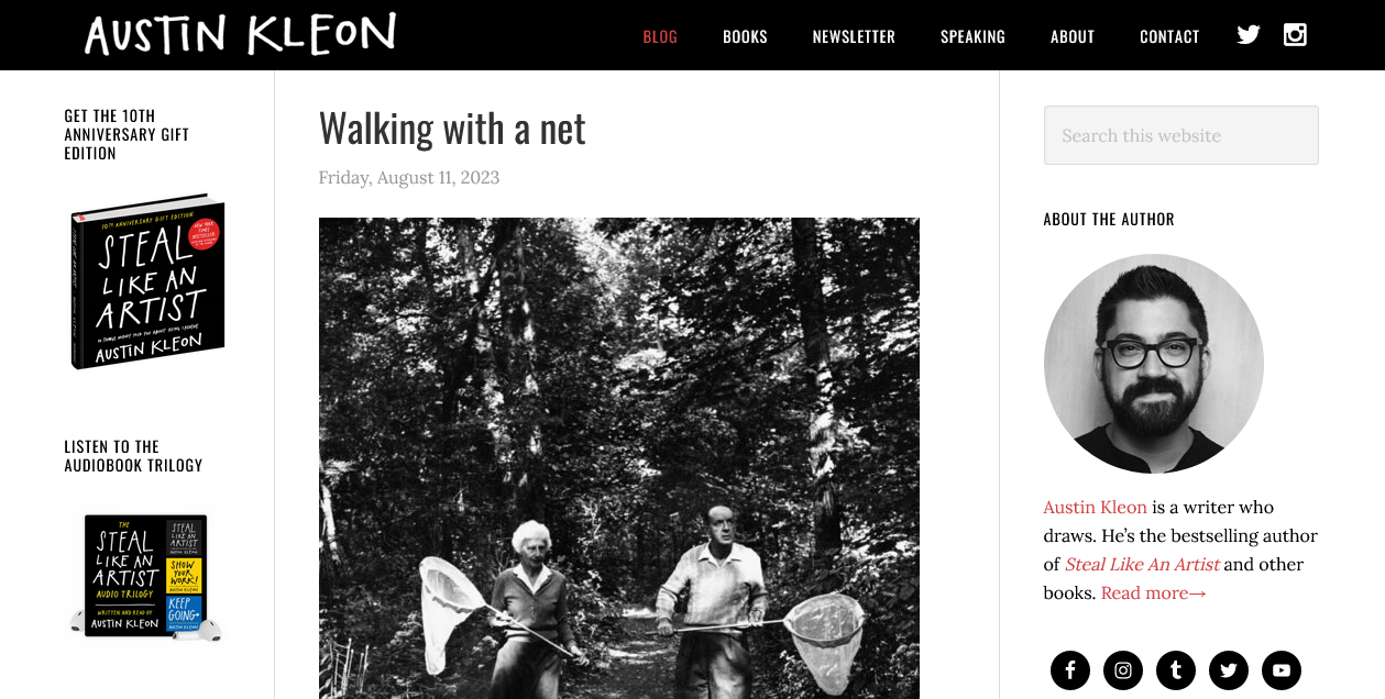 Si desea comenzar un blog personal, el sitio de Austin Kleon es una gran fuente de inspiración. Este autor de libros muy vendidos comparte sus pensamientos sobre una variedad de temas, desde hablar en público hasta las horas de trabajo y la promoción de sus libros.