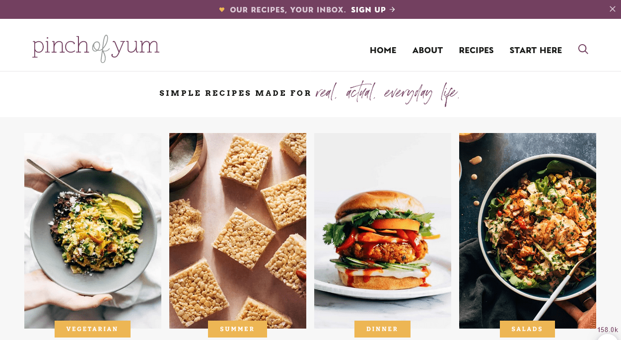 Los amantes de la cocina pueden encontrar recetas fáciles y deliciosas en el blog de comida Pinch of Yum. Dado que este blog tiene muchas entradas, utiliza un diseño que facilita la navegación.