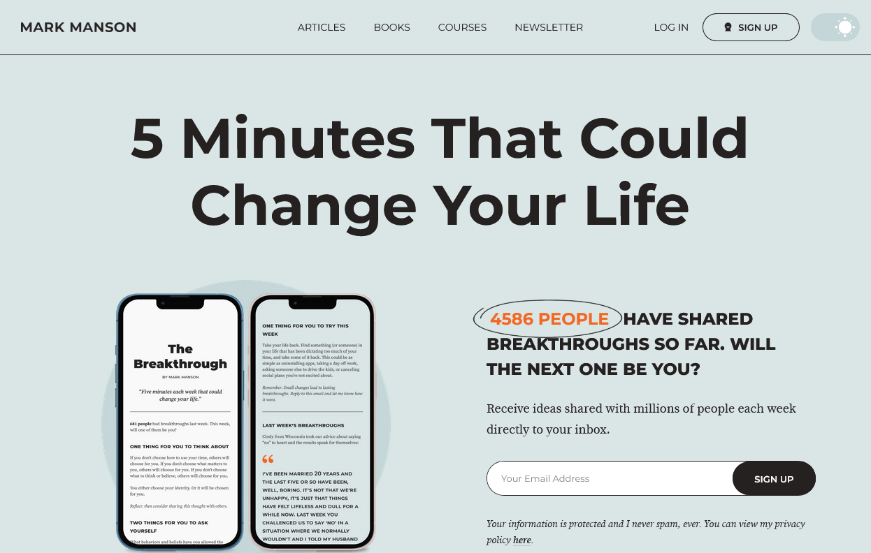 - Membresía: Mark Manson ofrece una ubicación ideal para un magneto de clavo que atrae a los visitantes.