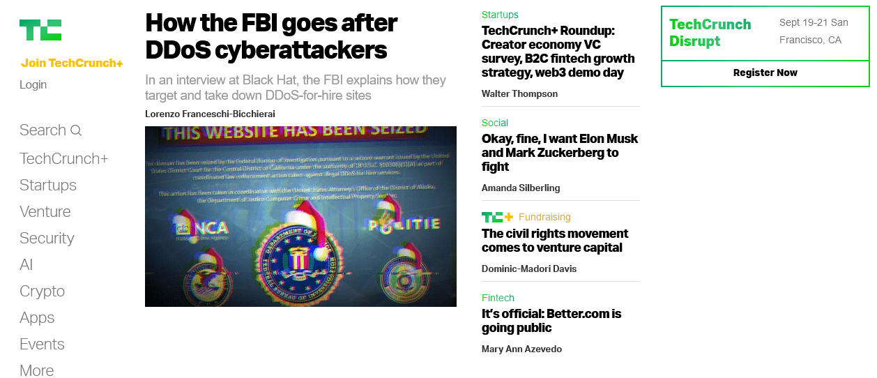 Tech Crunch es una empresa de medios en línea que se concentra en startups y tecnología. La estructura de columnas de la página web permite a Tech Crunch mostrar su página principal con una variedad de noticias recientes de diferentes categorías.