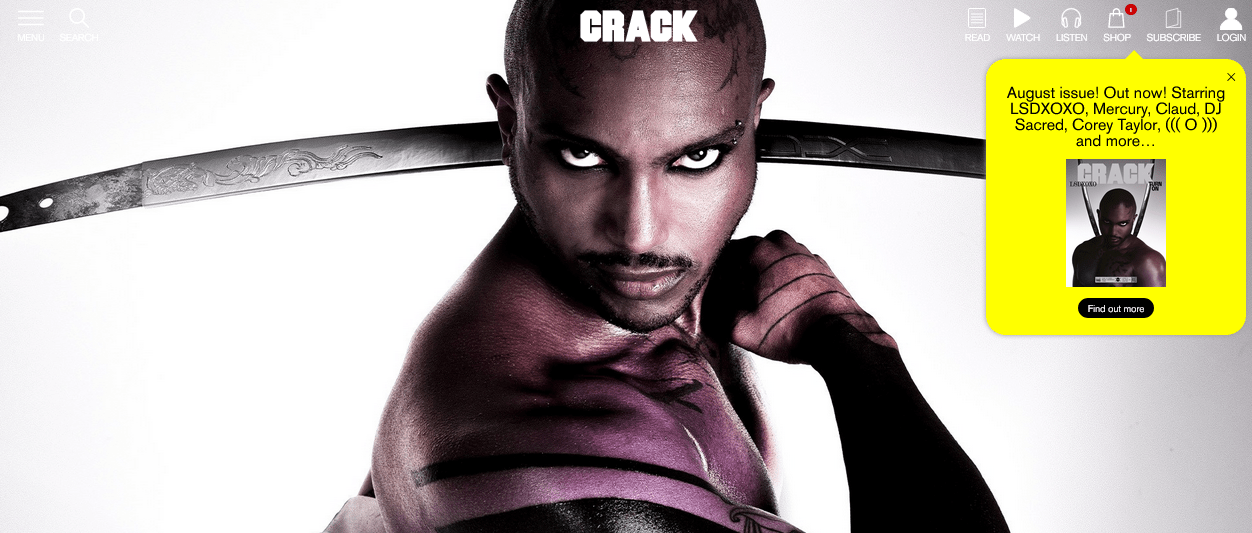 Crack es una revista en línea independiente que analiza la música y la cultura modernas. Esta utiliza imágenes que se deslizan en pantalla completa para mostrar los artículos destacados en la parte superior de la página de inicio y colocar los demás en la parte inferior.