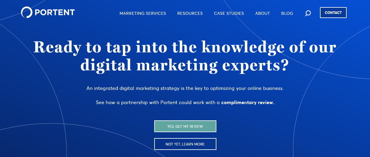 Los usuarios pueden encontrar un botón de «Más información» cuando se desplazan hacia abajo para obtener más información sobre cada servicio. Portent utiliza un diseño de página web simple y pocas imágenes para mantener a los visitantes enfocados en los elementos importantes.