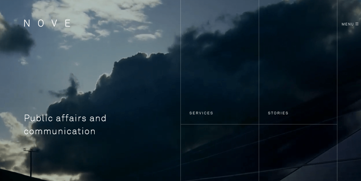 Nove es un excelente ejemplo si necesita inspiración para un diseño de sitio web minimalista y sofisticado. Esta agencia de asesoramiento usa imágenes de pantalla completa y videos como fondo de su sitio web.
