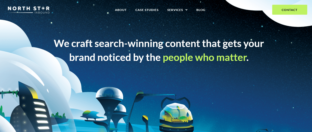 North Star, una agencia de marketing de contenidos, tiene un diseño visual distintivo para su sitio web. Para mantener una marca e identidad visual coherente, utiliza un fondo de ilustración de cielo nocturno estrellado en todo el sitio web.