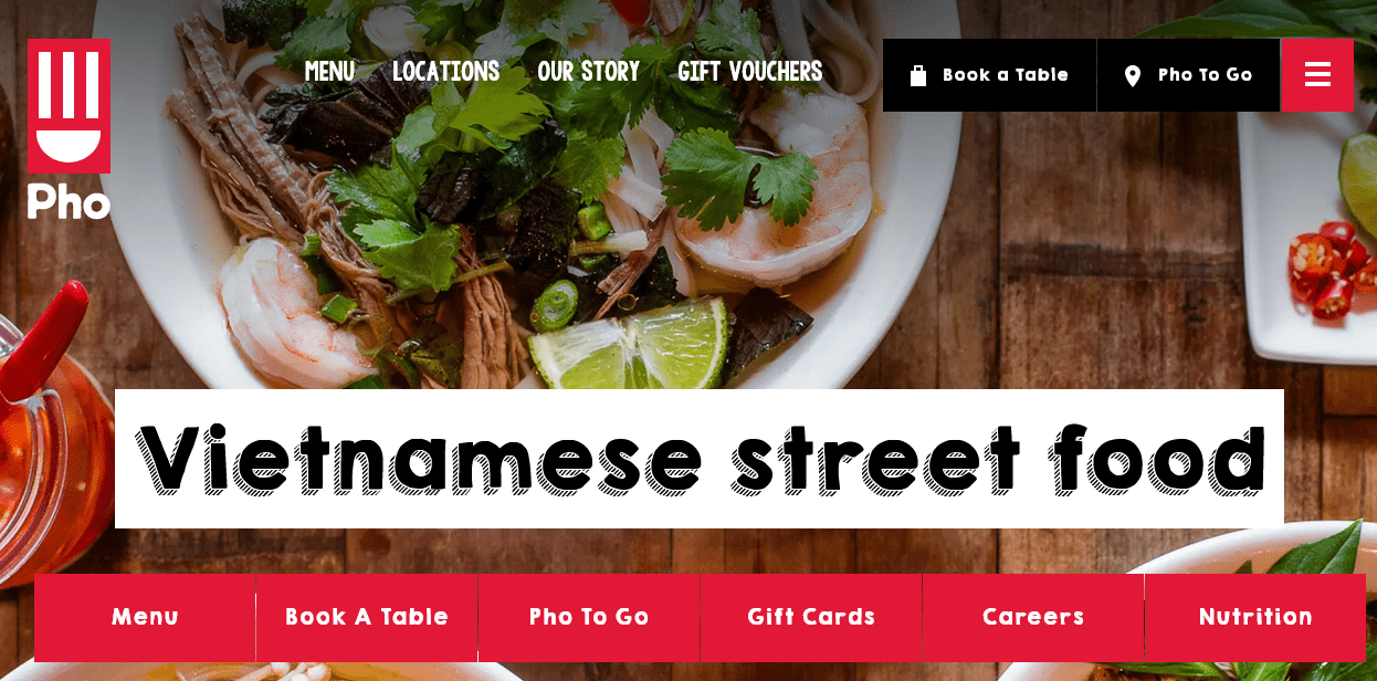 Pho Cafe es un restaurante vietnamita de comida callejera con varias sucursales en el Reino Unido. Con la fuente KG Happy y los dibujos animados personalizados en el fondo, su sitio web es único y divertido.