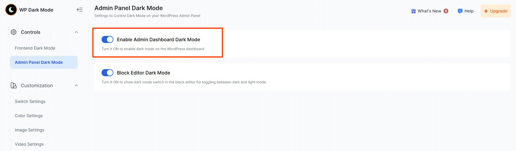 - Busca la opción Enable Admin Dashboard Dark Mode y actívala. Esto hará que el panel de administración de WordPress muestre el modo oscuro cuando inicies sesión.