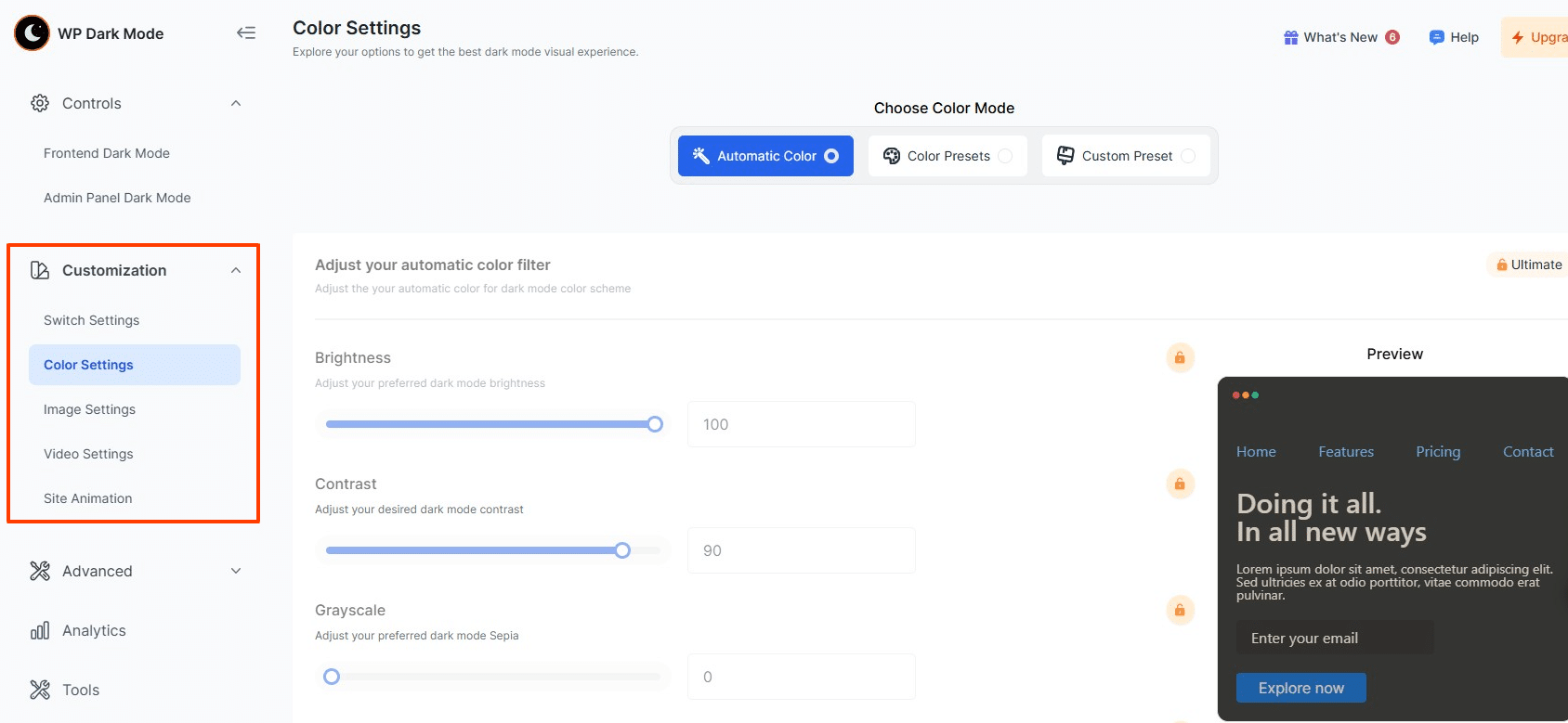 WP Dark Mode ofrece algunas opciones de personalización que te permiten ajustar la apariencia del modo oscuro en WordPress de acuerdo con tus preferencias.