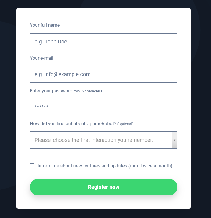Uptime Robot es una herramienta de monitoreo que, entre otras funciones, te permite monitorear tu servidor, aplicación o sitio web y configurar alertas para estar al tanto de lo que ocurre. En su versión gratuita, te permitirá agregar múltiples sensores y realizar chequeos cada cinco minutos.