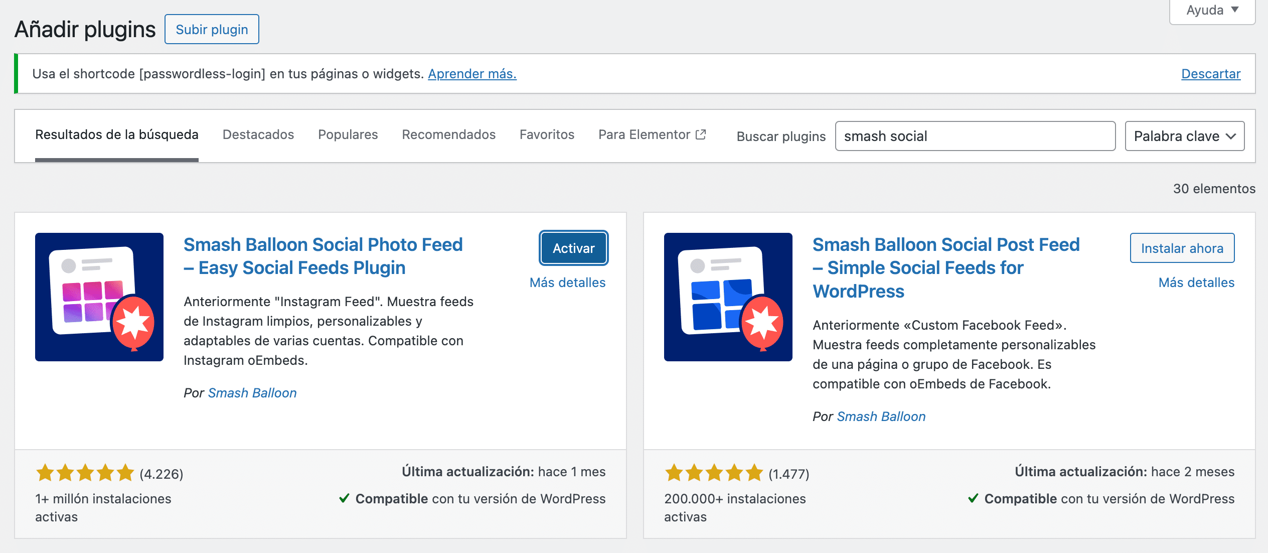 - Busca «Smash Balloon Social Photo Feed» en la barra de búsqueda.