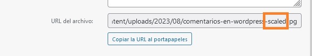 En el cuadro de la imagen, buscamos nuestra URL de archivo. A continuación, eliminamos el atributo «-scaled» del final de nuestra URL de imagen.