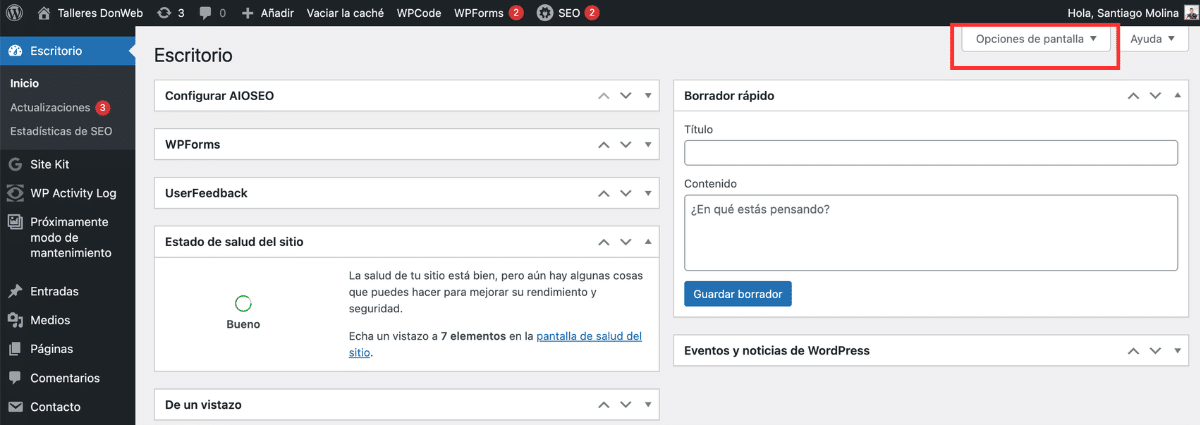 - Ir a la parte superior derecha: En el dashboard, haz clic en la pestaña «Opciones de Pantalla» ubicada en la parte superior derecha.