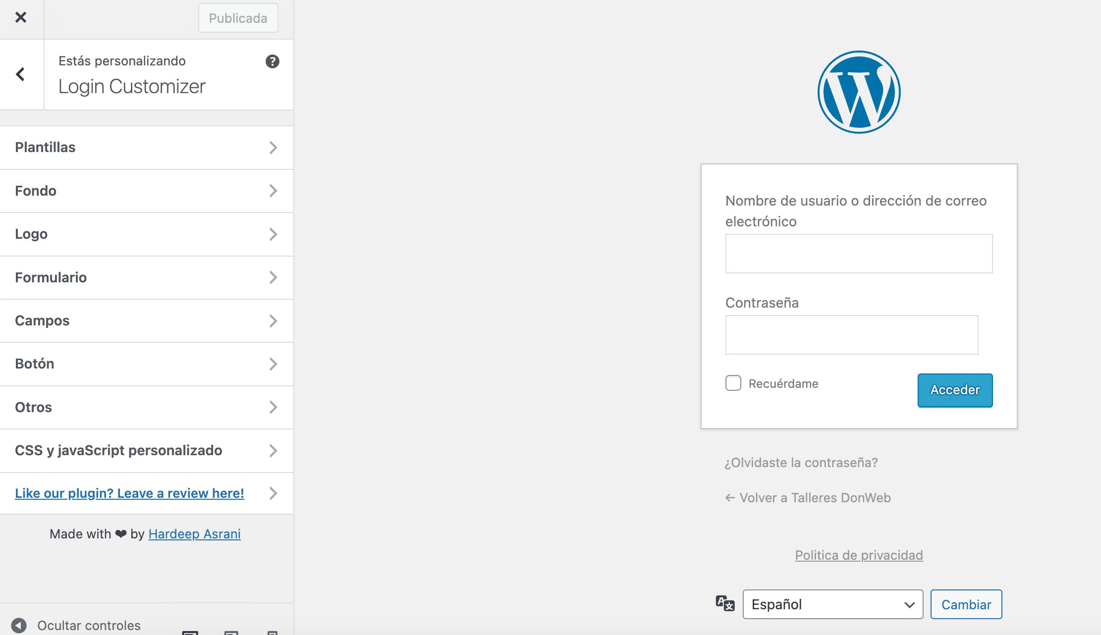 - Ve a «Apariencia» > «Login Customizer».