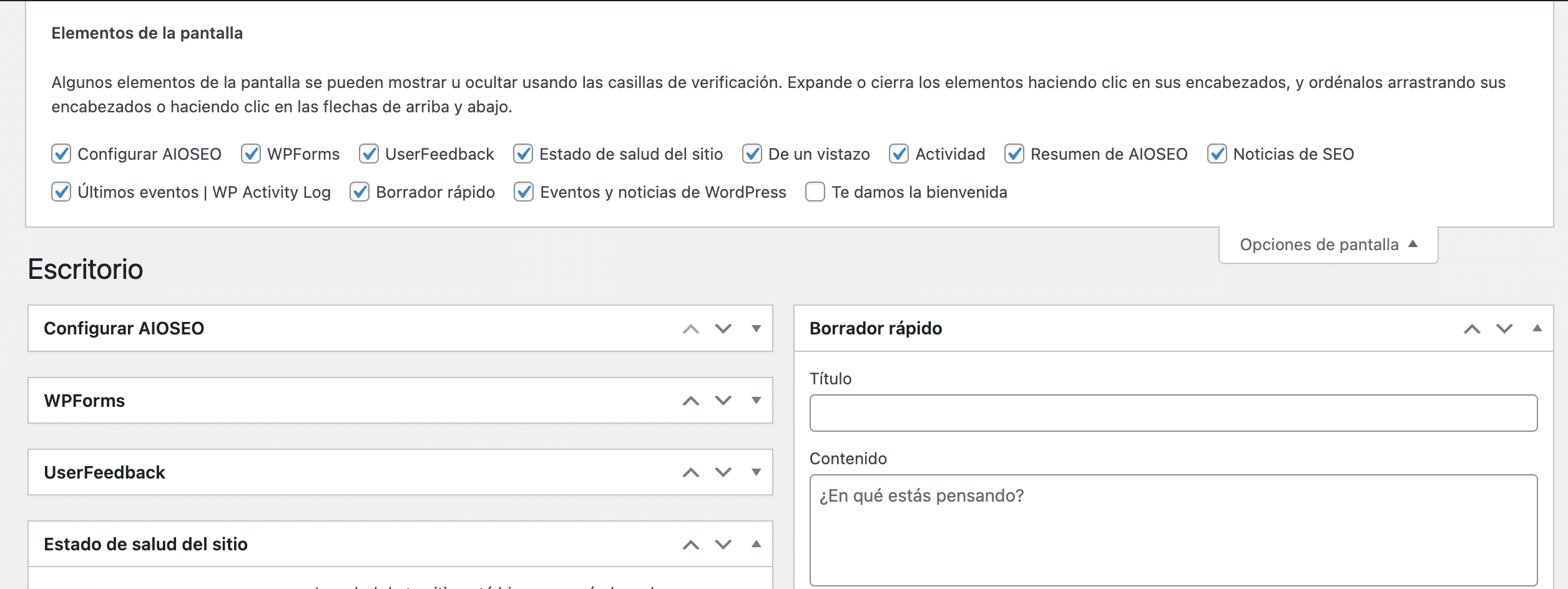 WordPress tiene una funcionalidad integrada llamada «Opciones de Pantalla» que permite mostrar u ocultar diferentes secciones del dashboard. Para acceder a esta opción: