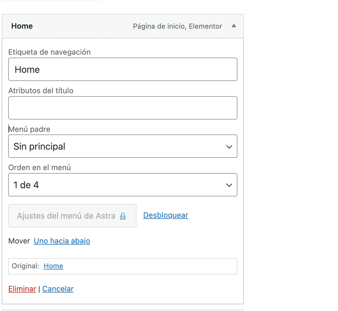 Una vez que habilites las propiedades avanzadas de menú, verás que se añaden campos adicionales en cada ítem de menú. Estos campos te permitirán personalizar de manera más detallada cada enlace de tu menú. Por ejemplo, podrás agregar clases CSS personalizadas para diseñar el menú de acuerdo con el estilo de tu sitio, incluir atributos de título que proporcionan información adicional cuando los usuarios pasan el cursor sobre los enlaces, o configurar la opción para que los enlaces se abran en una nueva pestaña.