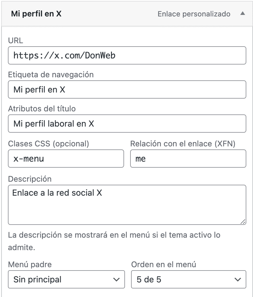 rel="nofollow", lo que le indica a los motores de búsqueda que no sigan ese enlace, útil cuando se enlaza a redes sociales o sitios externos. - Descripción: Si el tema lo permite, se puede agregar una breve descripción del enlace, como «Sigue nuestras actualizaciones en X», lo que añade valor informativo al menú.
