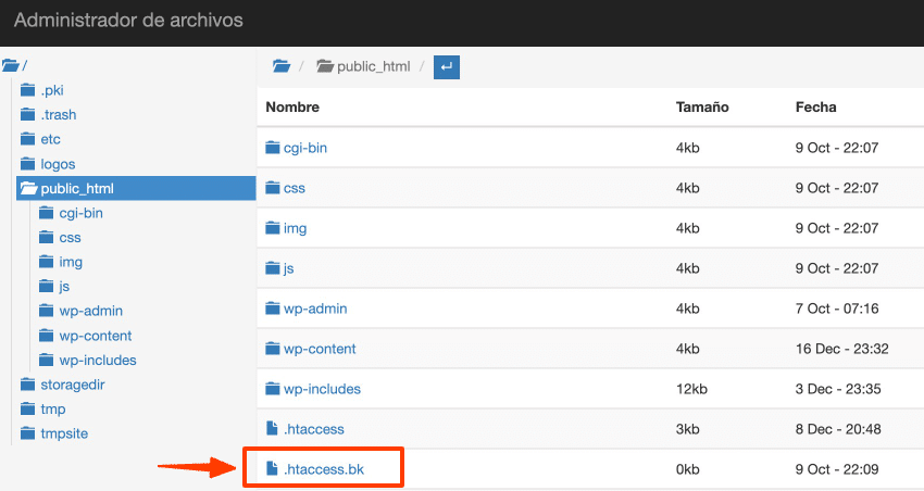 Si sospechas que el archivo htaccess está dañado, una forma rápida de solucionar el problema es renombrarlo o eliminarlo temporalmente.