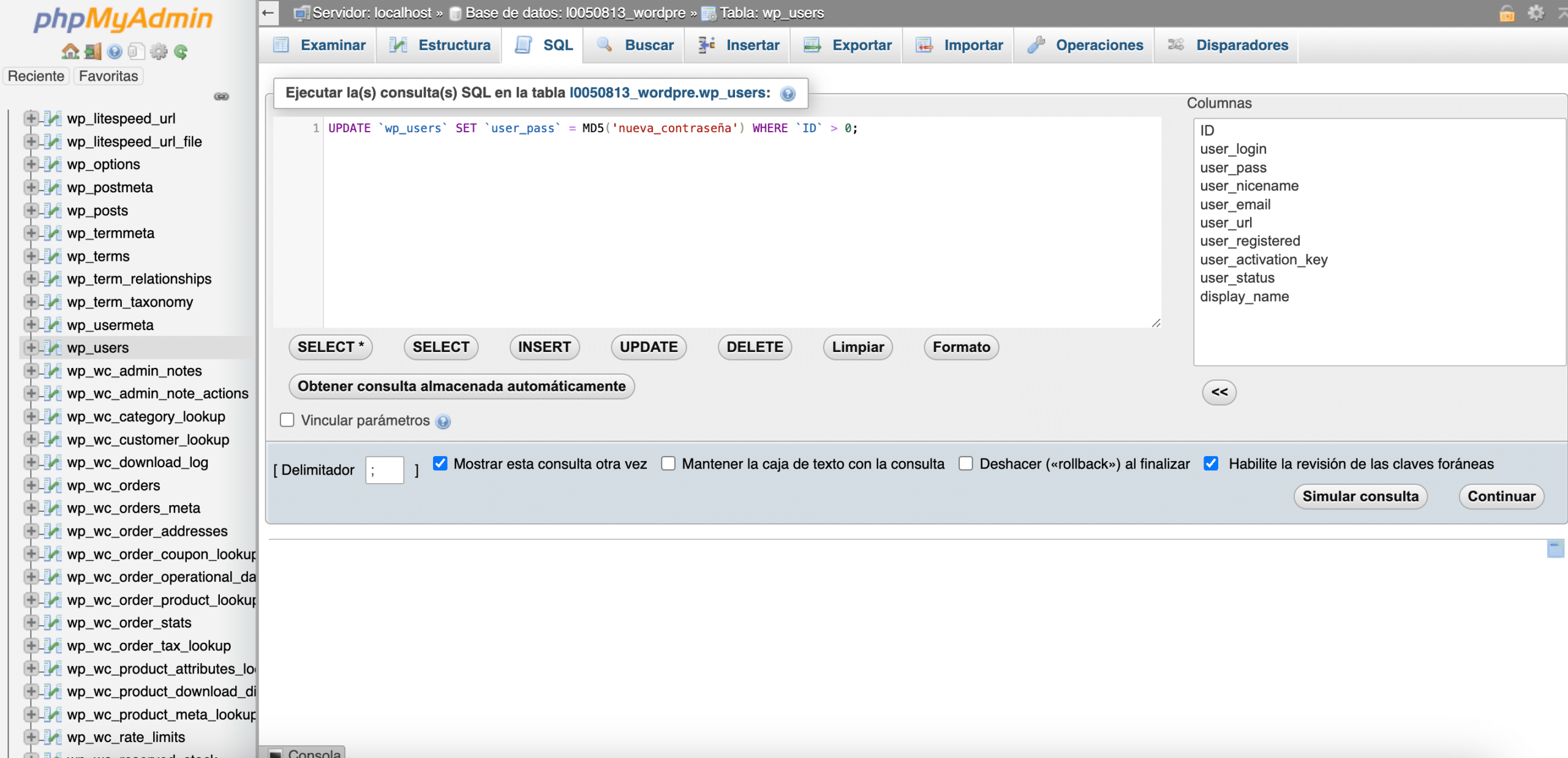 - En phpMyAdmin, abre la pestaña SQL e ingresa la siguiente consulta para restablecer las contraseñas de todos los usuarios: