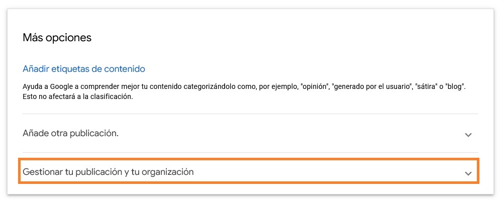 Deberás desplazarse hasta el cuadro «Más opciones» y ampliar la sección «Gestionar tu publicación y tu organización» haciendo clic en la flecha situada a la derecha de la pantalla.