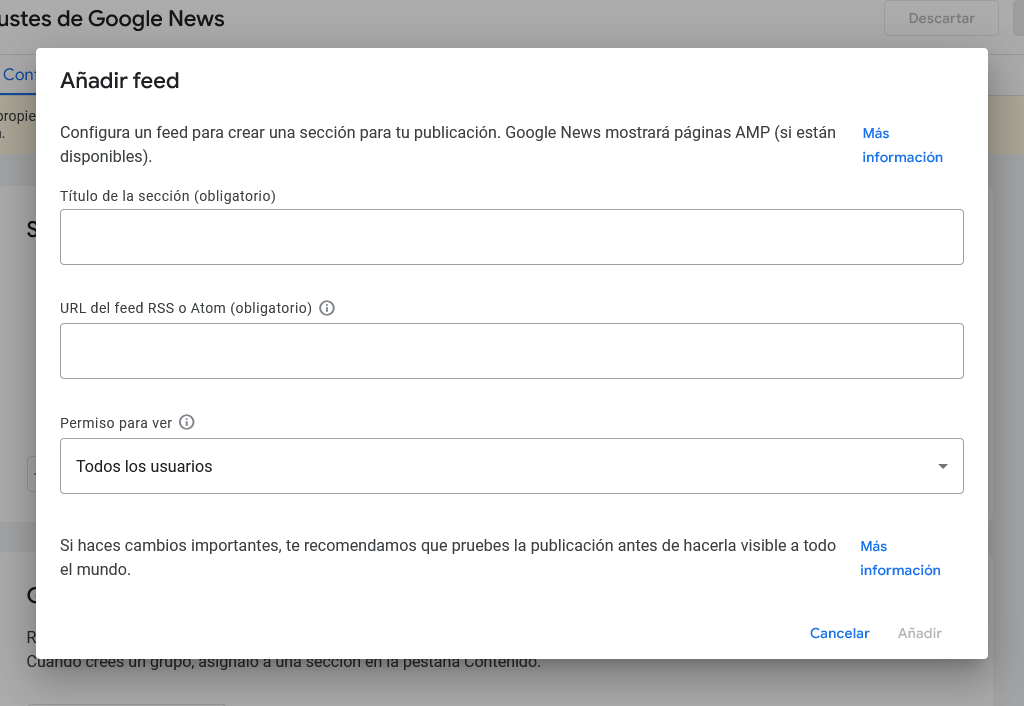 Añade un título para la sección, la URL del canal RSS que Google Noticias utilizará como fuente de contenido y selecciona quién puede ver esta sección.