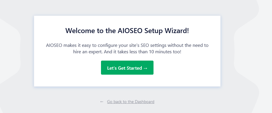 Tras la activación, el plugin iniciará un asistente de configuración. Puedes hacer clic en el botón «Let’s Get Started» para configurar AIOSEO en tu sitio.