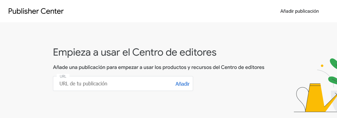 Una vez que hayas accedido, verás la página «Empieza a usar el Centro de editores». Simplemente haz clic en el enlace «Añadir su publicación» para continuar. También puede introducir la URL de tu sitio web y hacer clic en «Añadir».