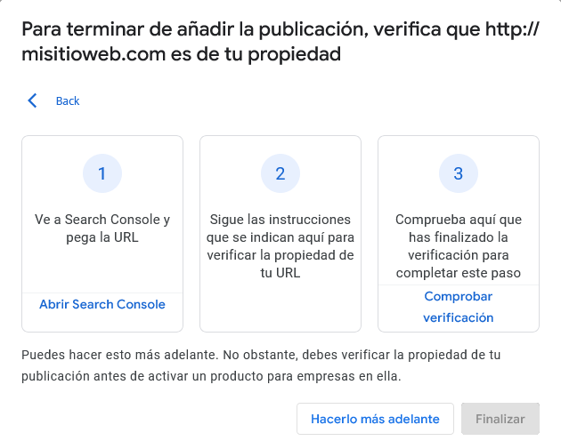 Si aún no has verificado con Google que eres el propietario del sitio web, se te pedirá que lo hagas ahora.