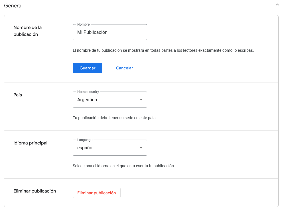 En la parte superior de la página, verá algunos ajustes generales, incluyendo el nombre de la publicación, el país y el idioma que introdujo anteriormente. Puedes modificarlos si es necesario.