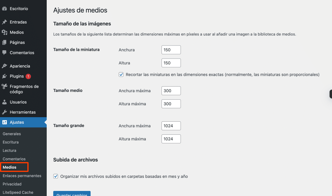 Si accedes a Ajustes > Medios en tu panel de WordPress, encontrarás opciones para definir tres de los tamaños predeterminados: Miniatura, Mediano y Grande.
