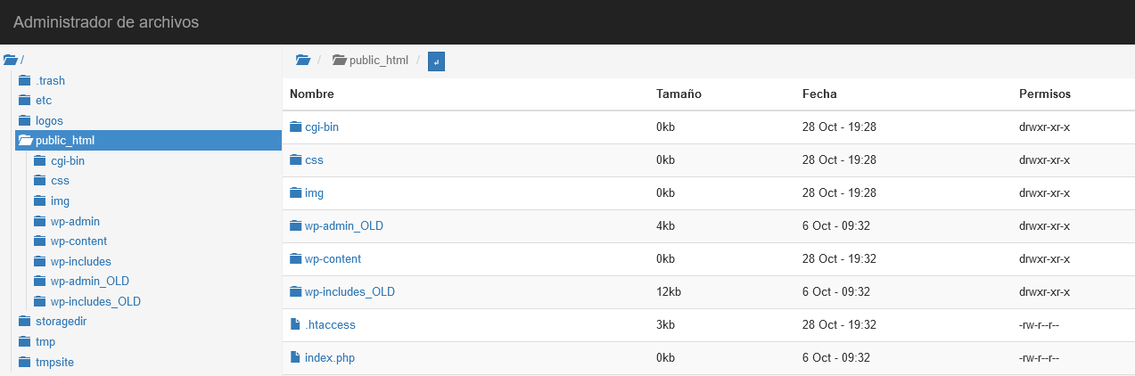 3. Se debe elegir el directorio de la aplicación en public_html y renombrar los directorios wp-admin, wp-includes y el fichero wp-settings.php. Por ejemplo, los archivos wp-admin_old, wp-includes_old y wp-settings.php_old.